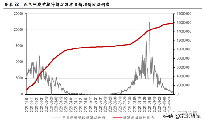 截至 9 月底,以色列共接种新冠疫苗 1518.76 剂,其中包括 341.5 万剂加 强针。随着加强针的铺开,当地疫情再次出现明显地好转,10 月份单日新增病例数已由万例级别逐 渐下降至三位数水平。两轮疫情爆发初期,以色列能够及时地提升疫苗接种数。随着疫苗接种的提升, 单日新增病例数能够在约 1 个月后出现明显的下滑,与疫苗的生效时间相呼应,证明了疫苗对于疫 情控制的有效性。此外,第二轮疫情爆发的时间与第一轮疫苗有效期的结束时间几乎吻合,对于评 估疫苗有效期的长短起到一定作用,为未来疫情疫苗的走势提供了预测依据。