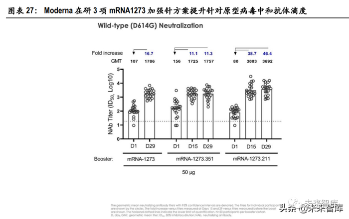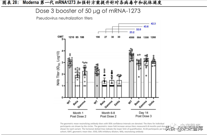 Moderna 同时也公布了加强针针对不同变异株的中和抗体几何滴度的变化。常规接 种 2 剂次后,经过 6-8 个月,对各变异株的中和抗体均有所下降,但仍能够被检测到。以常规接种完 成 6-8 月后留存的中和抗体滴度为基准,以 50ug 第一代 mRNA-1273 疫苗作为加强针,接种 14 天后, 得到以下数据:针对原型病毒(WT)的中和抗体滴度增加 23.2 倍,针对 Beta 变异株的中和抗体滴度 增加 32.0 倍,针对 Gamma 变异株的滴度增加 43.6 倍,针对 Delta 变异株的滴度增加 42.3 倍。
