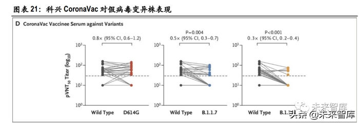 随着疫情的大肆流行,病毒开始出现多种变异。变异株的出现对于已有的新冠疫苗提出了挑战。由 于国内接种的国药、科兴疫苗均是以第一代野生型新冠病毒为基础,因此,诱导的免疫细胞的识别 对象也是第一代野生型病毒。变异株有可能无法被识别,造成疫苗效力削弱。以科兴疫苗在一次假病毒试验的数据为例,科兴新冠疫苗面对 D614G 单位点突变使疫苗诱导的 50% 假病毒中和抗体滴度下降至面对野生型病毒(WT)的 0.8 倍,面对 B.1.1.7(Alpha)时降至 WT 的 0.5 倍,面对 B.1.351(Beta)时降至 WT 的 0.3 倍,且有多个样本中检测不到中和抗体。因此,在考虑到 变异株的情况下,疫苗能够提供的保护率或许下降得更快。