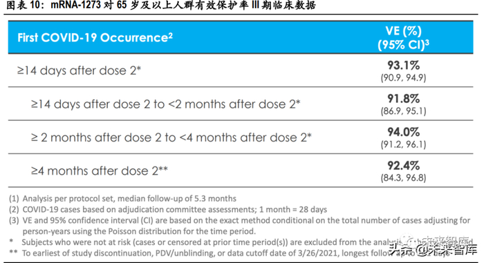 Moderna 公司与美国国家过敏及传染疾病研究所(NIAID)研发的 mRNA-1273 也给出了相似的 III 期临床 结果。在本次针对 18 岁以上人群的临床试验中,样本人数为 28207 人。在完成第 2 剂接种 14 天后, 测得 mRNA1273 疫苗保护率约为 94.1%(95%CI:89.3%-96.8%)。在 3583 位 65 岁及以上的老年人群样本中,测得疫苗保护率为 86.4%,维持在较高水平。