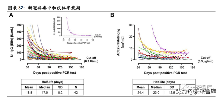 2021 年 10 月 30 日,中国疾控中心免疫规划首席专家王华庆先生在国务院联防联控机制新闻发布会 上表示,部分灭活疫苗接种完第三针满一个月后,和接种完第二针满一个月后相比,接种者抗体水 平提升约 5 倍。针对新冠病毒的中和抗体的平均半衰期为 20.4 天,其中 S1-IgG 的平均半衰期为 18.8 天,ACE2 抑制 Ig 的平均半衰期为 24.4 天。加强针诱导的额外 5 倍抗体滴度能够在主要免疫程序保护 期的基础上延长 2.32 个半衰期,约合 47.33 天。以乐观假设灭活疫苗中和抗体滴度能够维持在有效水 平以上约 6 个月,则加强针诱导的中和抗体滴度能够维持约 8 个月。