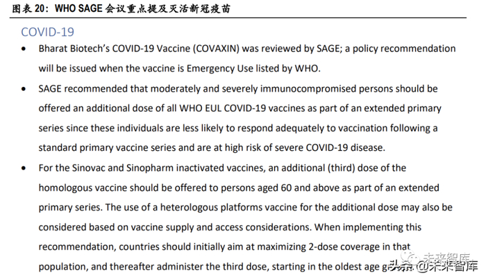 0 月 4 日-7 日,国际卫生组织 WHO 的 SAGE 专家会纪要中专门提到:接种国药或科兴灭活新冠疫 苗的 60 岁及以上人群,应(should)及时接种第三针,原则上推荐使用同源疫苗,但也可根据供 需情况考虑非同源的疫苗。而此前 WHO 多次表达反对过早开始加强针接种,尤其是在全球疫苗 缺口巨大,大量发展中国家需求远未满足的情况下。WHO 仅仅建议(recommended)中重度免疫 缺陷者接种加强针。
