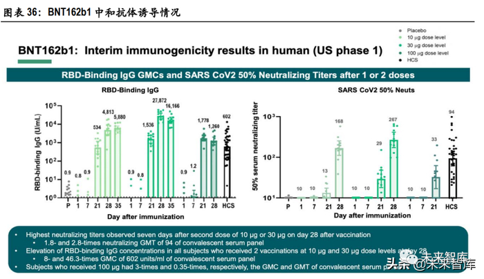 军科院秦成峰教授在 2021 中关村第二届全球科学与生命健康论坛上披露,公司与艾博生物、军科院 共同研发的新冠 mRNA 疫苗目前显示能够诱导 2 倍于康复者血清的中和抗体滴度,与此前 BioNTech 的另一候选疫苗 BNT162b1 表现接近。根据 BioNTech 的披露,接种第二针 7 天后,10ug 和 30ug 剂量的 BNT162b1 诱导的中和抗体滴度分别为康复者血清的 1.8 倍和 2.8 倍,诱导的与 RBD 结合的 IgG 为康复 者血清的 8 倍和 46.3 倍。