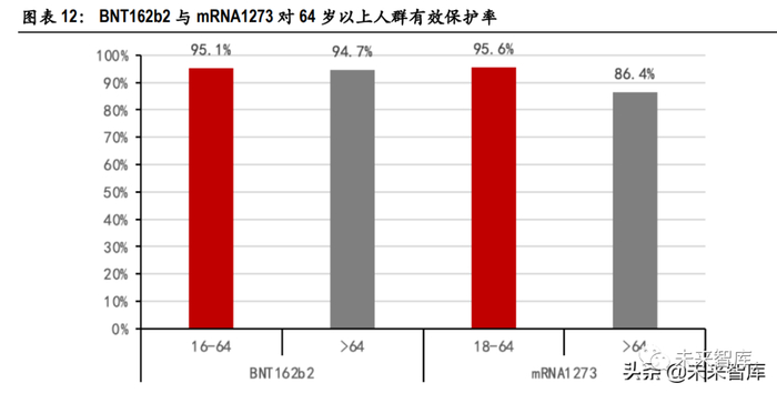 III 期临床数据显示 mRNA 疫苗对新冠病毒的保护率高达 94%以上,国药传统灭活疫苗的保护率虽 远远高于 WHO 和 FDA 建议标准的 50%,但仍与 mRNA 疫苗差距明显。同时,mRNA 疫苗对 65 岁 及以上的老年群体的保护作用也非常可观:BNT162b2 对 64 岁以上群体的保护率为 94.7%,仅比 16-64 岁群体数据低 0.4%。Moderna 的 mRNA1273 对 64 岁以上人群的保护率为 86.4%,甚至高于灭 活疫苗的整体保护率。(报告来源:未来智库)