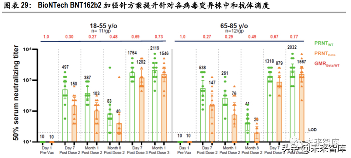 2021 年 7 月 28 日,辉瑞发布 21Q2 季度报告。报告披露,辉瑞和 BioNTech 正在推进 BNT162b2 新冠疫 苗第三剂加强针的 1/2/3 期临床试验。试验结果显示,在完成第二剂接种至少 6 个月后接种第三剂, 加强针能够非常明显地提升中和抗体滴度,重新激活免疫记忆,并提高免疫力。