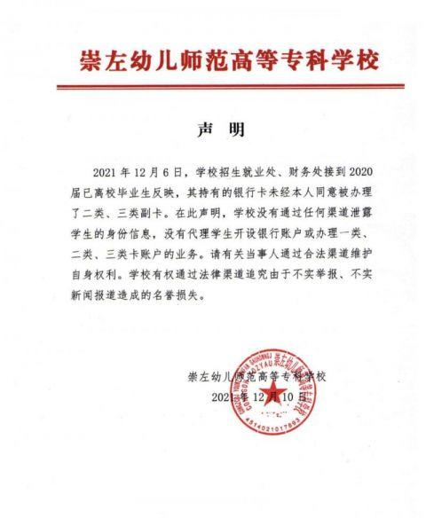 12月10日晚,崇左幼专发布官方声明称“2021年12月6日,学校招生就业处、财务处接到2020届已离校毕业生反映,其持有的银行卡未经本人同意被办理了二类、三类副卡。在此声明,学校没有通过任何渠道泄露学生的身份信息,没有代理学生开设银行账户或办理一类、二类、三类卡账户的业务。请有关当事人通过合法渠道维护自身权利。学校有权通过法律渠道追究由于不实举报、不实新闻报道造成的名誉损失。”