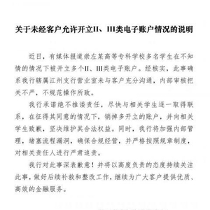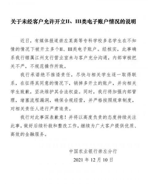 农行广西崇左分行今日声明的标题就是“未经客户允许开立II、III类电子账户情况”。该分行在声明中将此事定义为“确系我行辖属江州支行营业室未与客户充分沟通,内部审核把关不严,不规范操作所致。”该分行承诺绝不推诿责任,尽快与相关学生逐一取得联系,在征得其同意的情况下,销掉多开立的账户,并向相关学生致歉,坚决维护其合法权益。同时,将加强内部管理,堵塞流程漏洞,确保合规经营,并严格按照规章制度,对相关责任人进行严肃追责。