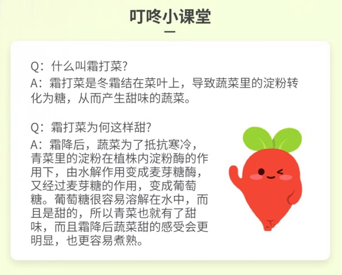 从口感上来看,霜打前后有较大口感差异的单品有:萝卜、青菜(包含矮脚青)、牛心菜、塔菜、红菜苔和白菜。