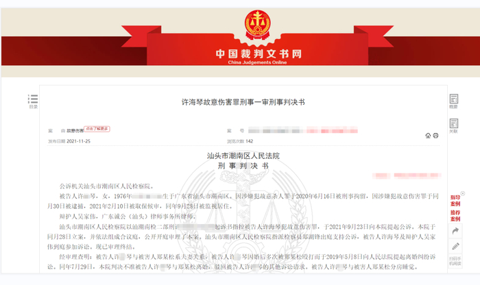 2020年6月16日,许某琴被当地警方刑事拘留,因涉嫌犯故意伤害罪于同月30日被逮捕,2021年2月10日被取保候审。