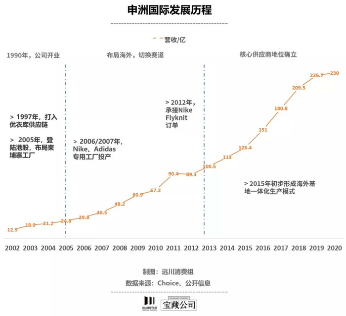 在Flyknit的助推下,申洲国际成功获得了Nike的优先供应权,业务能力也趁势上了一个新台阶。其营收从2005年上市之初的24.8亿,一路涨到了2020年230亿,年均复合增长率超过了16%。