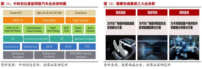 (1)中科创达:2013年开始正式进入智能网联汽车业务领域,目前在全球拥有超过200家智能网联汽车客户,不断深耕汽车软件市场,积累了丰富的、面向智能网联汽车的操作系统、3D引擎、机器视觉、语音和音频、自动化测试等产品和技术。公司能够提供从操作系统开发、核心技术授权到应用定制、自动化测试等一站式、全产品生命周期的解决方案、广泛应用于智能座舱、智能驾驶、基于车云一体的SOA的整车智能操作系统。2016-2020年,智能网联汽车业务持续收入CAGR高达102%,汽车业务收入在公司业务收入中的占比由2016年的5.45%,提升至2020年的29.31%。