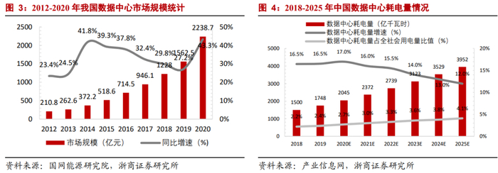 (1)云计算数据中心。A.高耗电:根据产业信息网数据,预计2020年我国数据中心年耗电量占全社会用电量的2.7%,2025年该比例将达到4.1%。B. IDC预计,2021-2024年,持续采用云计算可以助力全球减少超过10亿吨二氧化碳的排放。C.“数据中心+新能源”的成功实践广泛落地,零碳数据中心可期。