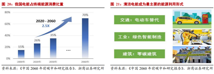 (3)能源消费侧,电能、新能源占比提升。根据朗新科技公告,2020年全社会用电量达到7.5万亿度,电能在终端能源消费的比重达到26%,随着各行业脱碳进程的加快,清洁电能在终端能源消费的比重将持续增加,电能占终端能源消费比重在2030年和2060年有望分别达到约35%和70%。