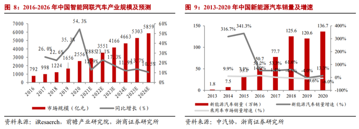 (2)智能网联汽车:汽车新三化(电动化、智能化、网联化)驱动下,智能网联汽车产业进入新景气周期。A. 智能网联汽车:根据iResearch、前瞻网数据,2020年产业规模达2556亿元,同比增长54.3%,预计2026年将达到5859亿元。B. 新能源汽车:根据中汽协数据,2020年,我国新能源汽车产销分别完成136.6万辆和136.7万辆,同比分别增长7.5%和10.9%。