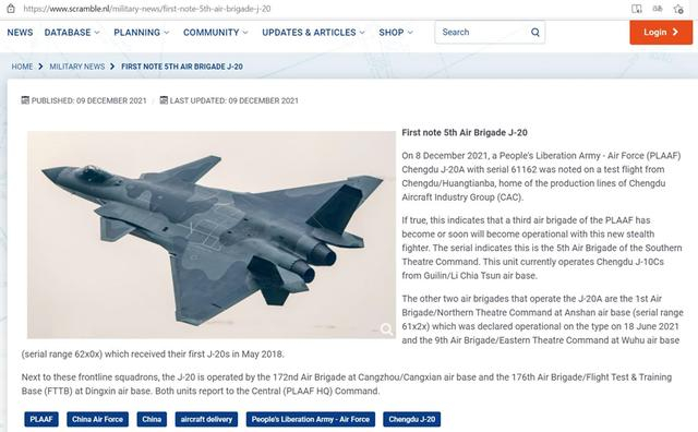 据荷兰飞航情报网《紧急起飞》(Scramble)9日报道,一架歼-20战机12月8日在中航工业成飞所在的成都黄田坝试飞时被发现。外媒的报道称,如果这是真的,意味解放军空军将有第3支航空旅已经或即将装备这款新战机。《紧急起飞》的文章宣称,机上序号显示,它隶属南部战区某航空旅。而目前该旅所装备的,是来自桂林某空军基地的歼-10C。