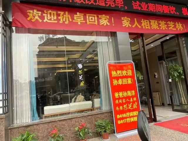 他们在老家湖北监利待了将近一天,临出发前,亲戚们一同吃了饭。饭店门口,张贴着“欢迎孙卓回家”的横幅和海报。