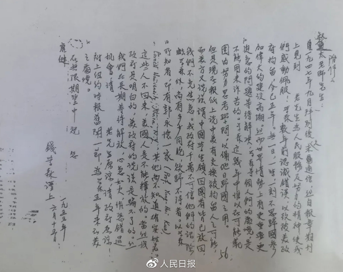 6月15日,钱学森在家中先写好草稿,然后用一手繁体汉字,端端正正写下这封至关重要的信。在信中,钱学森还附上了一份1953年3月6日《纽约时报》的剪报,内容是钱学森在美国遭到软禁的报道。