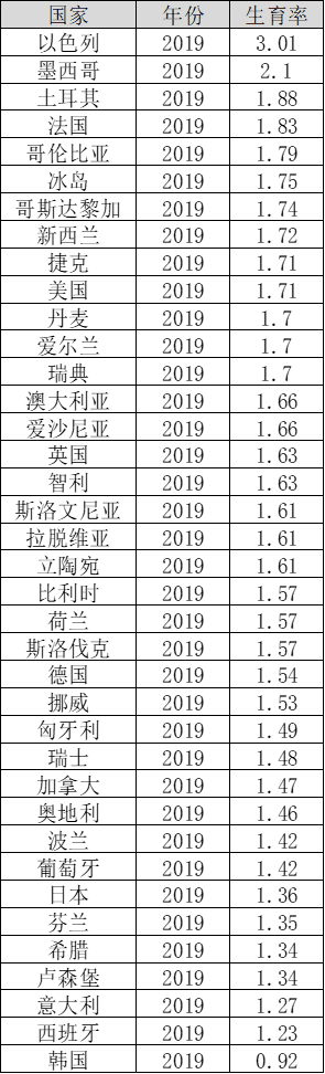 我把OECD国家2019年的生育率按照官网数据做了个表格如下,因为一些国家没有2020年的数据,所以全部用2019年的数据。