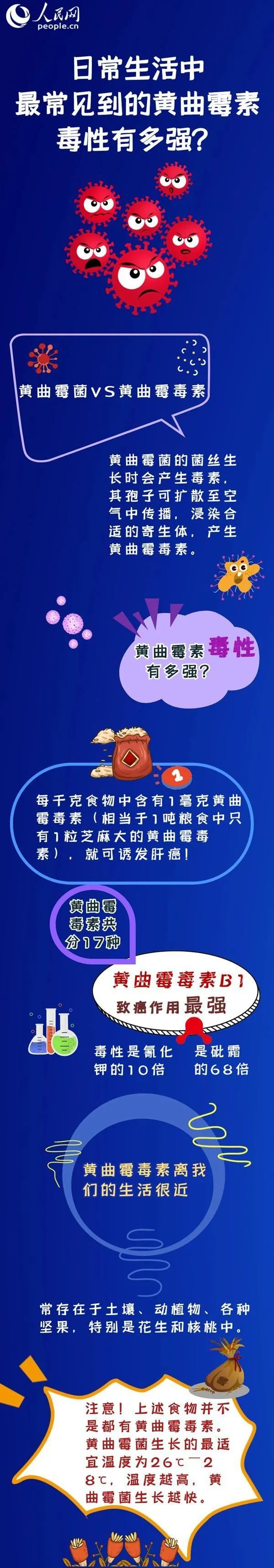 黄曲霉菌是一种大自然常见的霉菌。公开资料显示,黄曲霉毒素是黄曲霉菌的代谢产物,其滋生的温度为28℃-38℃,喜潮湿,一般情况下肉眼看不见,毒性为极毒,比眼镜蛇、金环蛇的毒汁还要毒,比人们熟知的剧毒药氰化钾要强10倍,比剧毒农药1605、1059的毒性强28~33倍。在1993年,该物质被世界卫生组织(WHO)的癌症研究机构划定为1类致癌物。