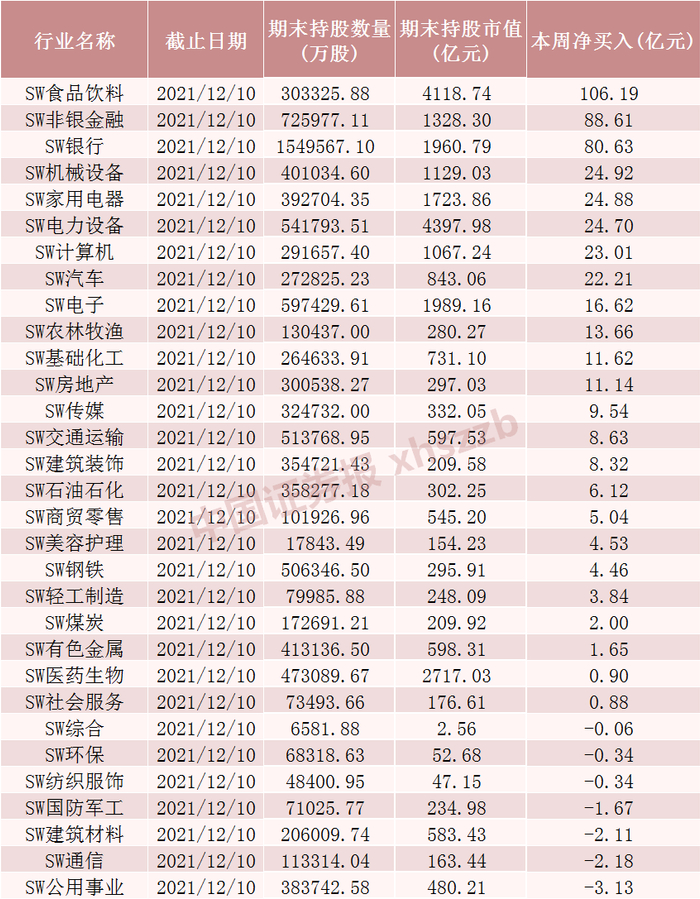 本周北向资金行业调仓情况