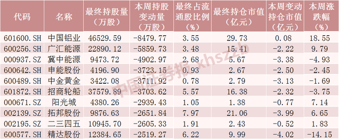 从市场表现来看,本周北向资金减仓股数居前十股涨跌参半,精达股份跌幅最大,本周累计下跌14.15%,中国铝业涨幅最大,本周上涨18.55%。