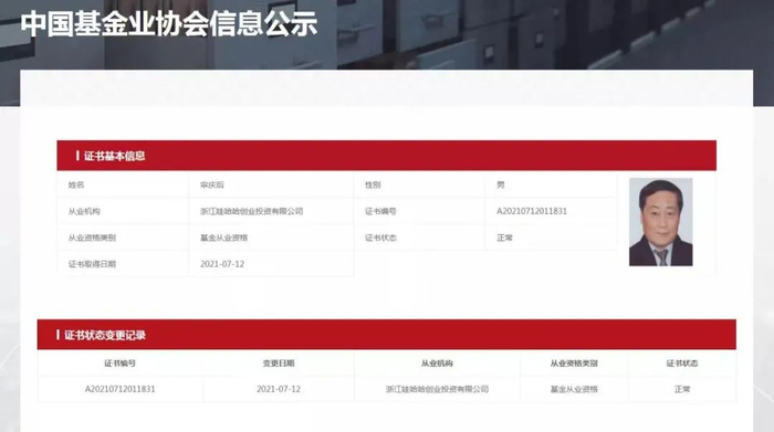 那么,宗庆后将会彻底退休吗?今年7月,娃哈哈创投正式完成基金管理人备案登记,而法定代表人正是宗庆后本人。更令人惊讶的是,已经高达76岁的宗庆后也在同一时间拿下了基金资格从业证书。如无意外,他的身影之后会更加密集地出现在创投圈。