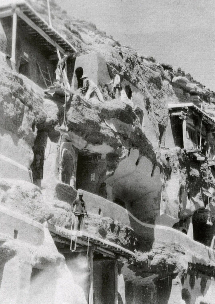 到10世纪的曹氏归义军时期,莫高窟崖面发生了另一个非常大的变化。1951年,考古学家宿白、陈明达等先生组成调查团,对莫高窟做了仔细调查,他们在莫高窟的崖面上发现了残存的露天大壁画,由南至北,蔓延半里长。虽然因为长期暴露在外,现在大壁画几乎看不见了,但从当时的痕迹调查来看,原来的壁画五光十色,有佛殿、祥云、天人,把整个莫高窟的山崖转化成一个佛国净土。这也是莫高窟第一次作为一个建筑整体被修缮和改建。改建者是曹氏归义军的统治者,他们集政权和教权于一身,建立了专门的机构,设置了专门的官员,对石窟的开凿和修缮进行集中管理。他们也把对莫高窟的全面修饰,当作自己的功绩。