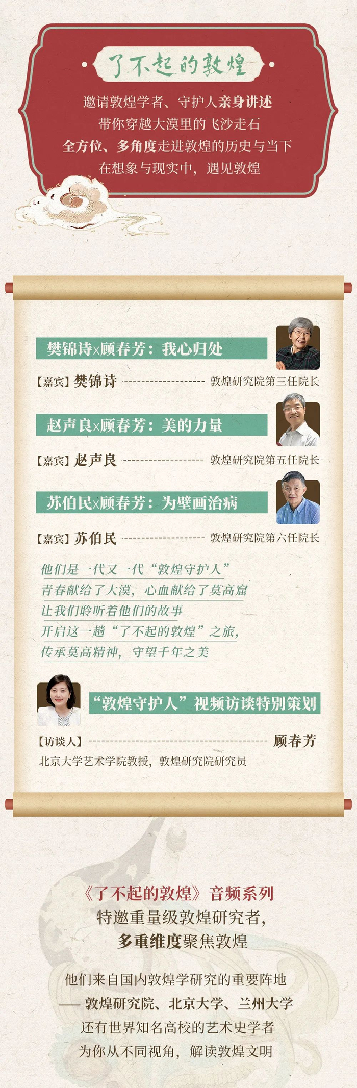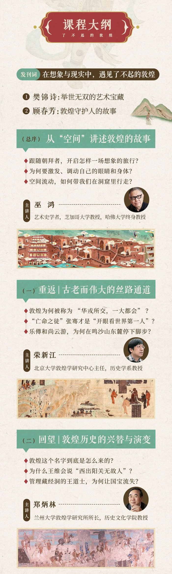 今年是中国现代考古学诞生100周年,三联中读有幸请到了包括樊锦诗、巫鸿、荣新江在内的13位国内最有资格讲敦煌的讲者,将这800多个洞窟、3000余身彩塑、50000余平方米壁画的往事与玄妙,讲给你听。