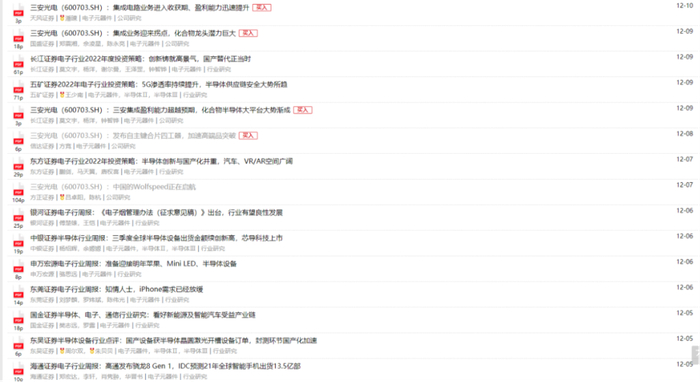 具体来看研报,上述华中券商分析师于12月6日发出了有关三安光电《中国的Wolfspeed正在启航》的深度报告,12月7日,AMC券商发布了有关三安光电《发布自主键合片四工器,加速高端品突破》的报告,此前11月7日该分析师也发布了电子行业周报,提及了三安光电。