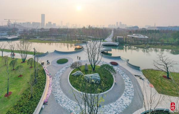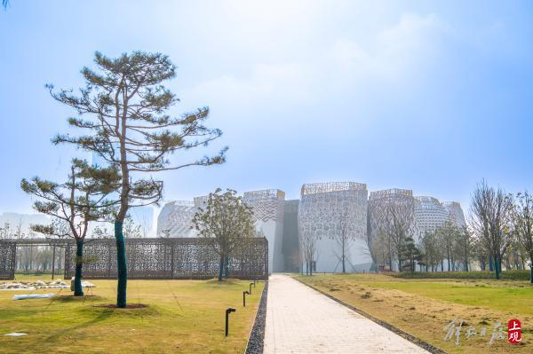 园中的雕塑别具一格。根据规划方案,除保留的世博场馆、必要的公园配套服务设施和园路场地外,公园中110公顷用地用于绿化种植,占公共绿地面积的70%以上,锚固公园生态本底。其中,近90公顷用于种植3万多棵高大乔木,形成高密度中心城巨大的绿肺森林。