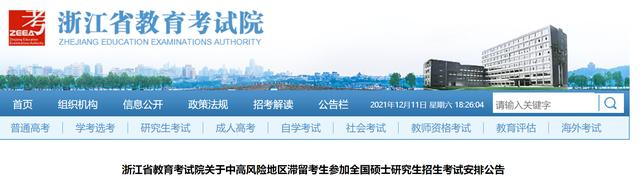 在12月10日晚,浙江省教育考试院发布了《关于中高风险地区滞留考生参加全国硕士研究生招生考试安排公告》指出,当前浙江省局部地区被列为中高风险地区。在省外参加考试滞留浙江省的考生可于12月17日前与报考点所在地省级招生考试机构联系,在征得同意后,可在浙江省借考。考生可同时与浙江省教育考试院联系,方便与相关省对接。