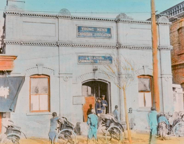 1918年,北京,两名身穿制服的军人站在基督教青年协会(YMCA)陆军大楼的台阶上,几辆黄包车在前面等候。