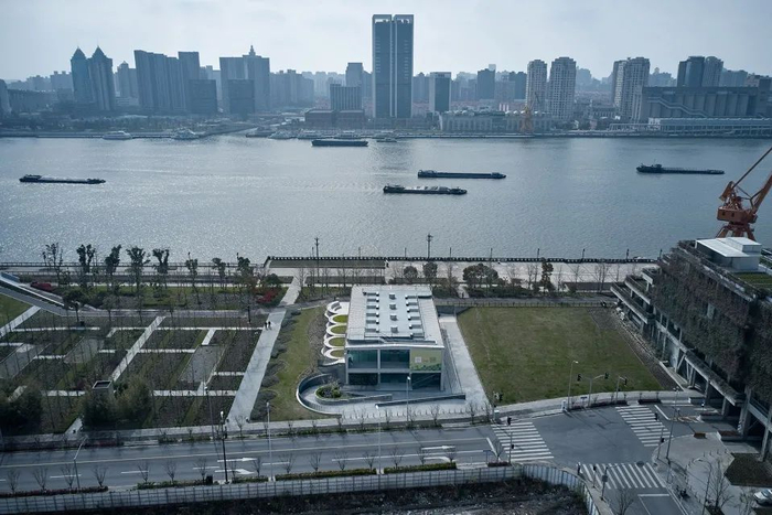 其内部进行细分,形成“绿丘中的小房子”,用于公共配套服务用房,至此,将城市尺度、建筑尺度和家具尺度统一在一座建筑当中,形成了丰富的身体经验。为了将天光引入内部,一改现状大板楼的幽暗,在建筑的中心、下穿城市道路的上方置入中庭,其中的双螺旋楼梯也起到了沟通各层的作用。整座建筑通过城市道路、坡道、楼梯、双螺旋中庭等多种交通空间在不同高度、不同方向上与城市和江岸进行连接。