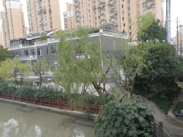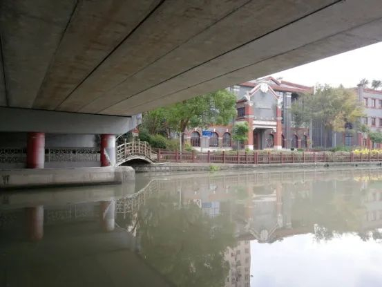 本次设计范围为三林老街(历史风貌区)范围内的三林塘港南岸局部范围,位于灵岩南路桥两侧,由灵岩南路桥下空间连接其两侧河道岸坡绿地。西侧有教育培训机构,东侧有传统菜馆,桥下通道即是防汛通道,也是连接东西绿地交通空间。