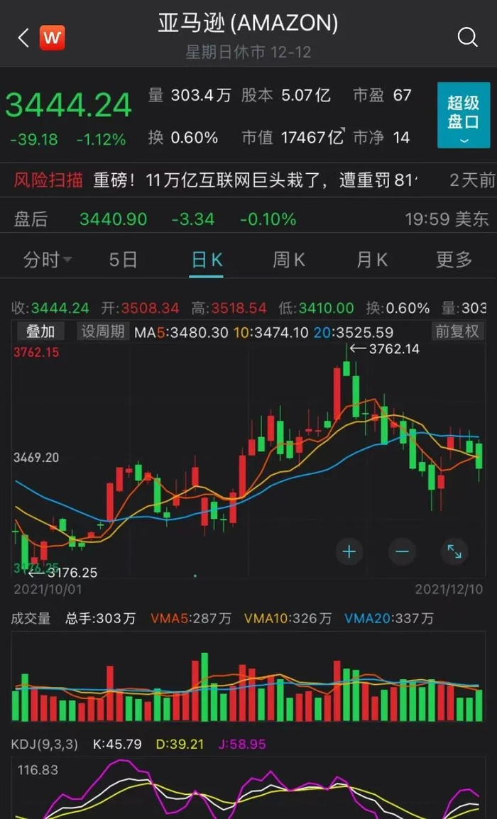 亚马逊公司股价已连续2日下跌,最新股价报3444.24美元/股,总市值17467亿美元。