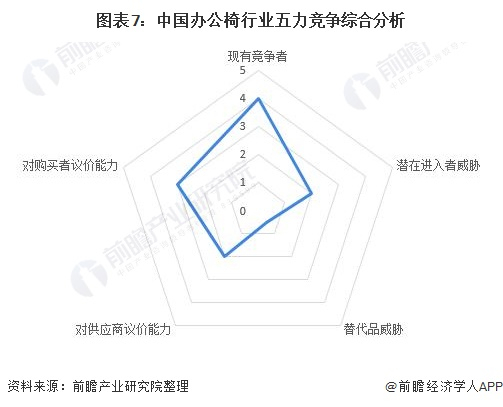 中国办公椅行业企业数量众多。并且中小微企业数量众多,头部企业数量稀少,上市公司数量更为稀少,且行业产品同质化严重,行业内现有竞争者的竞争很激烈。办公椅上游为钢铁、有色金属塑料、皮革、木材等常见原材料,行业对于上游的议价能力较弱。办公椅是企业政府等必需用品之一,对下游购买者议价能力适中。办公椅由于其行业特点和产品用途特性,潜在进入者威胁和替代品风险均较小。