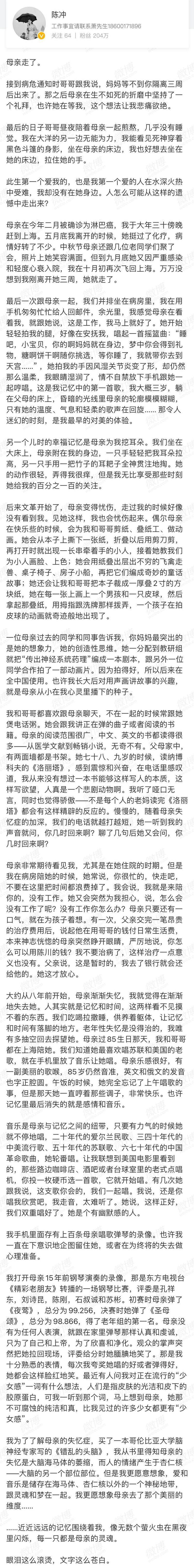原标题:陈冲微博悼母看哭无数人,背后串起我国两代药理学家“为人群服务”医者精神 来源:上观新闻
