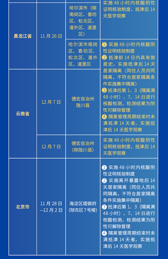 新增具有11月13日(含)以来途经呼伦贝尔市(除满洲里、新巴尔虎右旗)、11月26日(含)以来途经哈尔滨市(除南岗区、香坊区、松北区、道外区、道里区)、12月7日(含)以来途经云南省德宏自治州(除陇川县)旅居史的来津及返津人员,需持48小时内核酸阴性证明或出示包含核酸检测阴性信息的健康码“绿码”,主动向社区、工作单位等报备,实施抵津后14天医学观察。