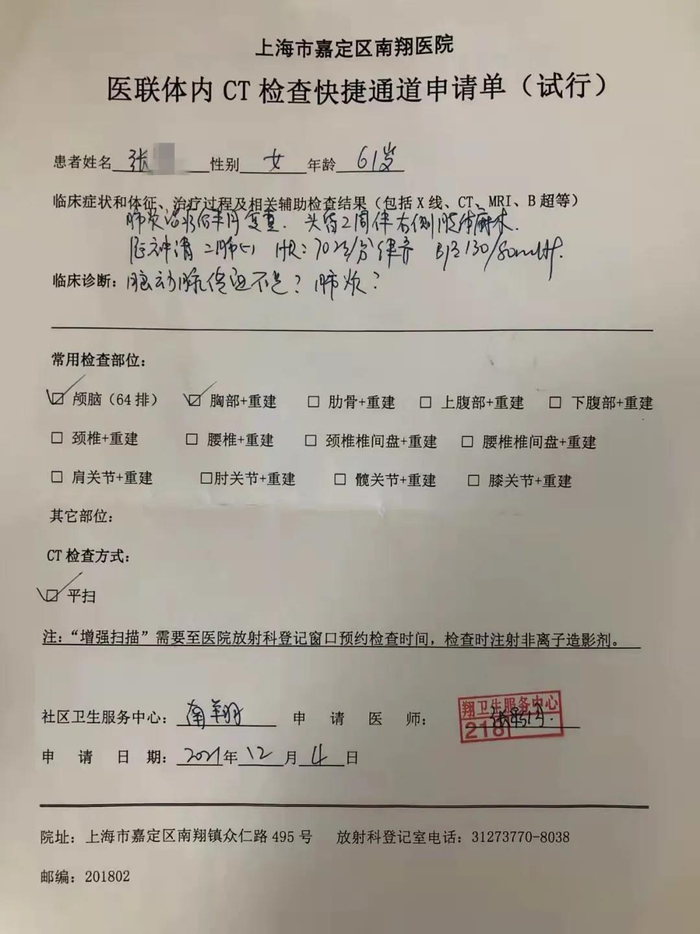 近日,张阿姨和往常一样来到南翔社区卫生服务中心家庭医生处测量血糖。张阿姨今年61岁,患有糖尿病,最近她总感觉有些胸痛、头昏,经仔细问诊和检查,医生认为张阿姨可能脑动脉供血不足或者是之前患的肺炎未痊愈,需到上级医院进行头颅和胸部ct检查,随即开出《南翔医院医联体内ct检查快捷通道申请单》。