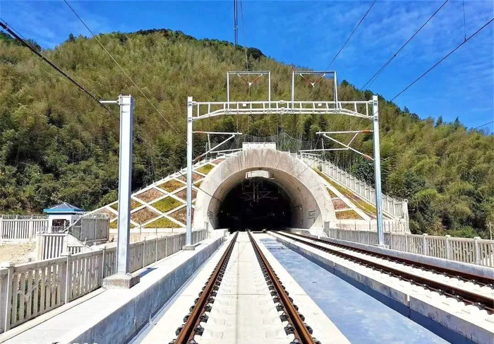 江西段,地处赣南山区,沿线地形起伏剧烈,山势陡峭,桥隧比达87.1%。线路五次跨越赣粤、赣定等高速公路干线,四次跨越繁忙干线京九铁路,多次穿过岩溶强发育地带、岩体破碎带松散堆积体等复杂地质段,有53座隧道,隧道总长63.781公里,占江西段全线总长的47.4%。