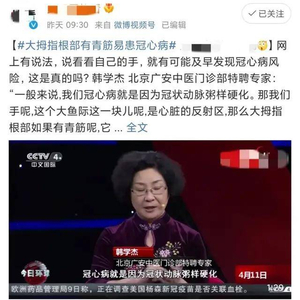 近日,有一则新闻报道:大拇指根部有青筋易患冠心病,引发热议。
