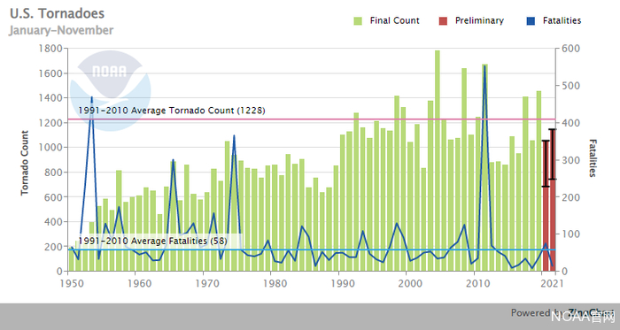 根据NOAA的数据,美国年均发生龙卷风约为1228次,1950年以来美国境内有59个EF5级龙卷,平均每年不到一个。历史上1974年是EF5级龙卷风发生最多的年份,4月3日发生了7个。从死亡人数上看,虽然EF5级龙卷风少,但因EF5级龙卷风死亡人数占了总死亡人数的一半以上,可见其强度和致灾性有多强。
