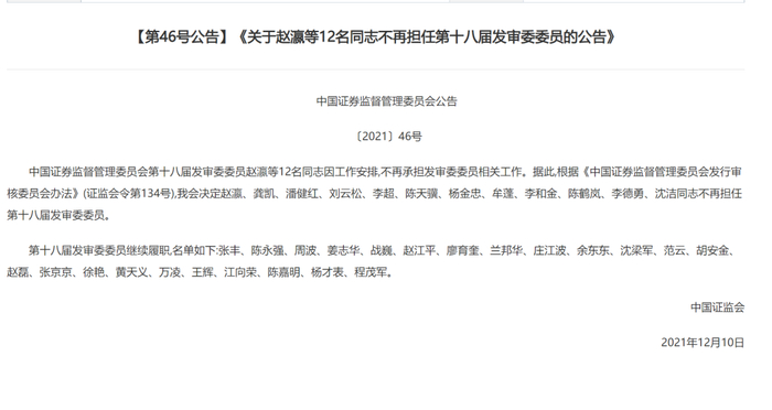2021年12月10日晚间,证监会官网发布中国证监会2021年第46号公告(下称“46号公告”),正式宣布赵瀛等12名在任发审委委员因工作安排,将不再承担发审委委员相关工作。