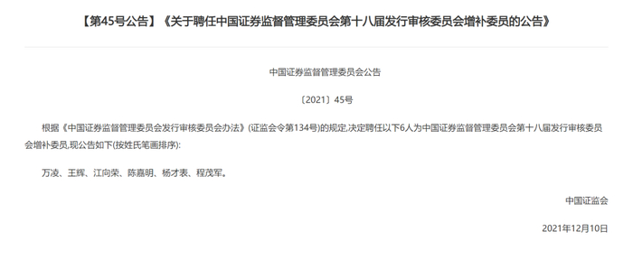 在46号公告发布的同时,证监会早前公示了近一个月余的第十八届发审委第二次增补委员的任命文件也新鲜出炉,包括万凌、王辉、江向荣等之前公示的六名拟任人员皆获得聘任。