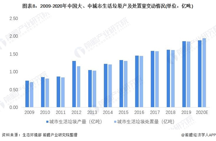 2009-2020年,我国城市生活垃圾产量和处置量整体呈现递增态势,根据生态环境部2020年12月公布的《2020年全国大、中城市固体废物污染环境防治年报》,2019年,196个大、中城市生活垃圾产生量1.854亿吨,处置量1.85亿吨,处置率达99.74%。2009-2019年,我国城市生活垃圾产量的复合增长率为9.5%,城市生活垃圾处理量的复合增长率为10.13%。2020年,我国城市生活垃圾产量和处理量均约在1.9亿吨左右,生活垃圾处置率进一步提高。