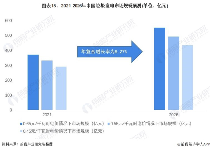 前瞻预估未来垃圾发电上网电价区间在0.45元/千瓦时-0.65元/千瓦时,则2026年垃圾发电行业预计市场规模约在400-500亿元区间。