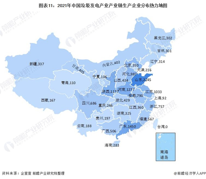 从我国垃圾发电产业链企业区域分布来看,垃圾发电产业产业链企业主要分布在山东地区,其次是在广东、陕西、江苏等地区。