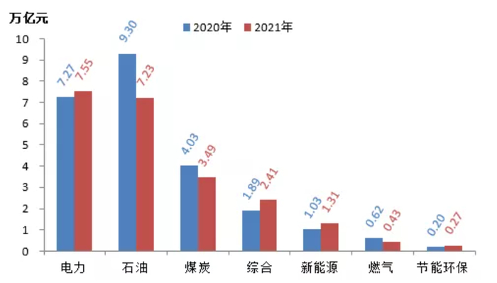 从营收总额来看,电力行业营收总额7.55万亿元,较上年小幅上涨3.83%,取代石油排名第一;石油退居第二,营收总额下滑22.32%至7.23万亿元;煤炭排名第三,下降13.49%至3.49万亿元。虽然石油、煤炭等传统能源企业营收同比大幅下降,但依然是营收大户。新能源排名第五,营收上涨27.29%至1.31亿元。