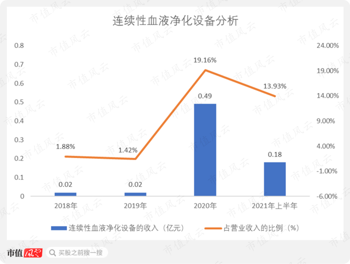 连续性血液净化设备收入在2018和2019年还只有0.02亿元,到了2020年和2021年上半年,就分别实现了0.49和0.18亿元的销售收入。