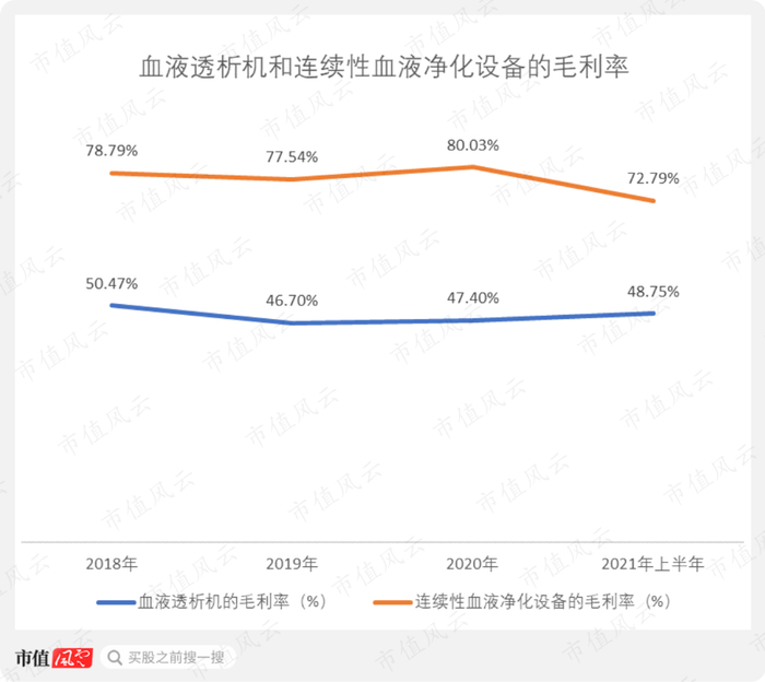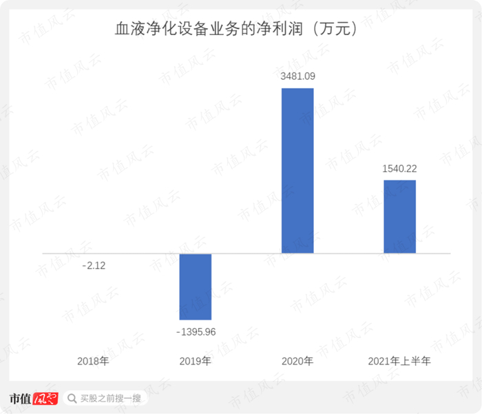 随后的2020年和2021年上半年,血液净化设备业务的净利润分别达到3481和1540万元,单项业务的净利率分别为26%和20%,盈利能力其实并不差。